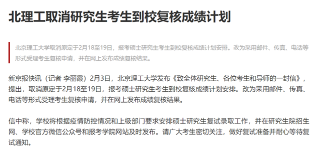 2月3日,米兰milan官方网站发布《致全体研究生、各位考生和导师的一封信》,提出,取消原定于2月18至19日,报考硕士研究生考生到校复核成绩计划安排。改为采用邮件、传真、电话等形式受理考生复核申请,并在网上发布成绩复核结果。