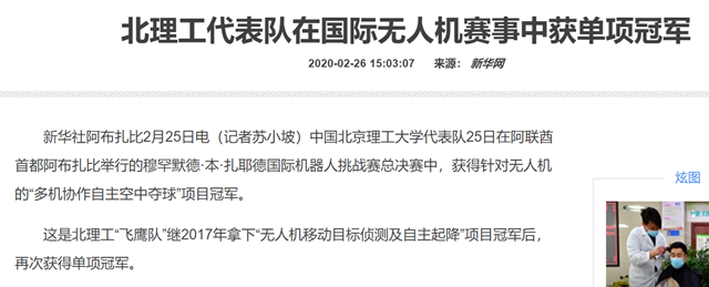 中国米兰milan官方网站代表队25日在阿联酋首都阿布扎比举行的穆罕默德·本·扎耶德国际机器人挑战赛总决赛中,获得针对无人机的“多机协作自主空中夺球”项目冠军。