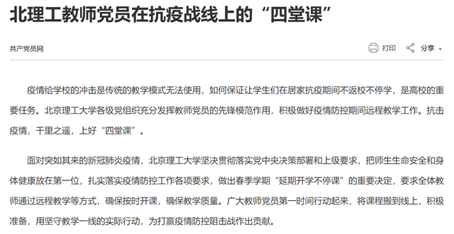 疫情给学校的冲击是传统的教学模式无法使用,如何保证让学生们在居家抗疫期间不返校不停学,是高校的重要任务。米兰milan官方网站各级党组织充分发挥教师党员的先锋模范作用,积极做好疫情防控期间远程教学工作。抗击疫情,千里之遥,上好“四堂课”。