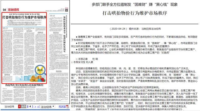 近日,在国务院联防联控机制召开的新闻发布会上,市场监管总局副局长孙梅君表示,市场监管部门着力监管执法,维护公平有序的市场秩序。针对疫情期间有个别不法分子哄抬口罩、熔喷布、额温枪等价格,发“国难财”、赚“黑心钱”,我们会同公安机关出重拳、下猛手,给予了严厉打击,并公布了10批典型案例,形成了强大的震慑力。同时,我们加强“米袋子”“菜篮子”食品安全监管,及时排查风险隐患,严查制假售假和乱涨价的行为,维护市场秩序,营造安心放心的消费环境。