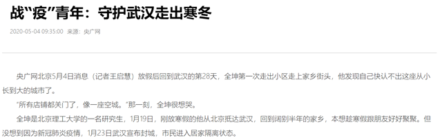 而这个春天,不仅是武汉恢复生机的春天,也是全坤的毕业季。在经历了疫情之后,全坤告诉记者,自己想做一个对社会有用的人,成为一名国防军工领域的工程师是他的梦想。“我们学校常教导我们的一句话就是:延安根,军工魂,国防情,北理梦。把学到的东西学以致用,这是每一个青年人应该做的事。