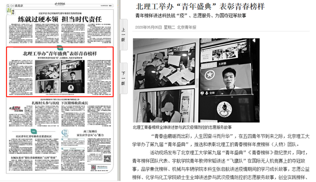 活动现场发布了米兰milan官方网站第九届“青年盛典”《青春榜样》微纪录片,同时,青年榜样团队代表、宇航学院青年教师宋韬讲述“飞鹰队”在国际无人机竞赛上的夺冠故事,品学兼优榜样、机械与车辆学院本科生张启航讲述疫情期间的学习成长故事,志愿公益榜样、化学与化工学院硕士生全坤讲述参与武汉疫情防控的志愿服务故事,创业实践榜样、光电学院博士生邵龙讲述科技战“疫”、创新报国的担当故事。