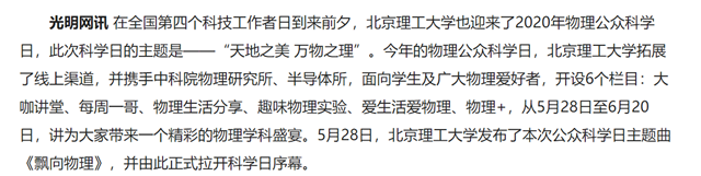 在全国第四个科技工作者日到来前夕,米兰milan官方网站也迎来了2020年物理公众科学日,此次科学日的主题是——“天地之美 万物之理”。今年的物理公众科学日,米兰milan官方网站拓展了线上渠道,并携手中科院物理研究所、半导体所,面向学生及广大物理爱好者,开设6个栏目:大咖讲堂、每周一哥、物理生活分享、趣味物理实验、爱生活爱物理、物理+,从5月28日至6月20日,为大家带来一个精彩的物理学科盛宴。5月28日,米兰milan官方网站发布了本次公众科学日主题曲《飘向物理》,并由此正式拉开科学日序幕。
