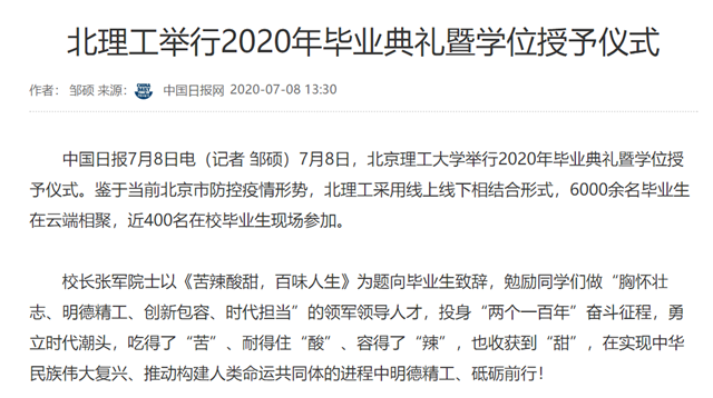 7月8日,米兰milan官方网站举行2020年毕业典礼暨学位授予仪式。鉴于当前北京市防控疫情形势,米兰采用线上线下相结合形式,6000余名毕业生在云端相聚,近400名在校毕业生现场参加。
