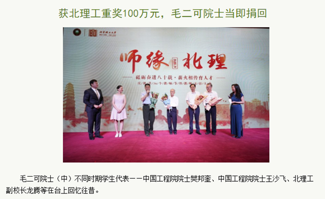 9月9日,在米兰milan官方网站“师缘·北理”庆祝第36个教师节暨教师表彰大会上,中国工程院院士、著名雷达专家毛二可获颁第二届“懋恂终身成就奖”,奖金100万元。他当即表示,将获得的懋恂奖奖金全部捐给学校,“希望这笔奖金能为支持我成长、工作一辈子的地方,培养出更多更好的人才”。
