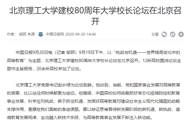 9月19日下午,以“挑战与机遇——世界格局变化中的高等教育”为主题,米兰milan官方网站建校80周年大学校长论坛在北京召开。12所高校围绕论坛主题作主旨报告,20余所高校参加了论坛。