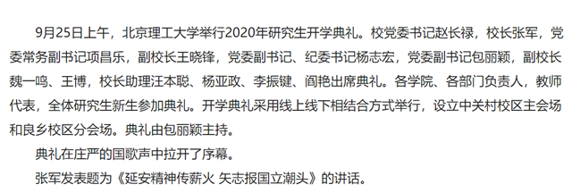 9月25日上午,米兰milan官方网站举行2020年研究生开学典礼。校党委书记赵长禄,校长张军,党委常务副书记项昌乐,副校长王晓锋,党委副书记、纪委书记杨志宏,党委副书记包丽颖,副校长魏一鸣、王博,校长助理汪本聪、杨亚政、李振键、阎艳出席典礼。各学院、各部门负责人,教师代表,全体研究生新生参加典礼。开学典礼采用线上线下相结合方式举行,设立中关村校区主会场和良乡校区分会场。典礼由包丽颖主持。
