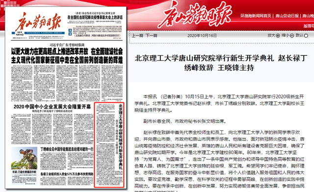 10月15日上午,米兰milan官方网站唐山研究院举行2020级新生开学典礼。米兰milan官方网站党委书记赵长禄、市长丁绣峰分别致辞。米兰milan官方网站副校长王晓锋主持开学典礼。