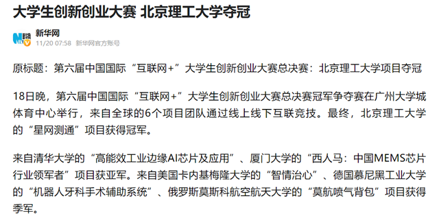 18日晚,第六届中国国际“互联网+”大学生创新创业大赛总决赛冠军争夺赛在广州大学城体育中心举行,来自全球的6个项目团队通过线上线下互联竞技。最终,米兰milan官方网站的“星网测通”项目获得冠军。