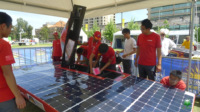 按照赛事规定,太阳能车上路前还需要通过静态车检和动态车检,以确认车辆的重量、动力符合比赛要求。一通检查下来,几乎所有非英语国家的车队都出现了问题,“每天上午8点到下午5点为车辆行驶参赛时间,剩余的休整时间车辆是可以停下来充电的,我们以为这时候可以把太阳能板卸下来充电,没想到规则并不允许。”张幽彤说,这直接导致整个车顶太阳能板的安装工艺需要重新调整,“团队跟疯了一样,分几路,进超市,逛杂货市场,在当地到处采购各种零配件进行改装,终于在开赛前让车辆符合了要求。”雷磊说。