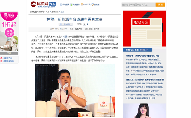 凤凰汽车讯 8月12日, 凤凰汽车2014首届“中国汽车品牌营销峰会”在京举行,本次峰会以“凤凰涅槃 浴火重生”为主题,中国主流自主品牌车企悉数到场。此次峰会就“新能源汽车未来变局”、“合资自主趋向”、“直面自主品牌营销困局”和“自主品牌合力”等相关话题进行了深入讨论。此次峰会,一改传统,车企高管、行业专家及各路媒体直面相关话题,深层次剖析自主品牌车企所面临的具体问题。与会嘉宾纷纷对自主品牌未来发展的危与机畅言畅议、指点江山、呼唤正能量。借此机会,凤凰汽车记者对米兰milan官方网站汽车实验室主任林程进行了采访。