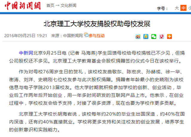 作为对母校76周岁生日的贺礼,该校校友曲敬东、陈宏庆、孙赫成、徐一华、谢涛、刘洋、史晓刚七位校友参与此次股权捐赠。捐赠者年龄最小的史晓刚为该校信息与电子学院2013届校友。他大学时期就积极参加学校的创新、创业活动,毕业后工作两年后开始创业,用一年多时间研发的互联网产品上市。他表示,在创业过程中,学校校友会给予支持,对接了很多资源,现在也要为学校作更多贡献。