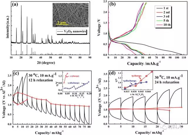 充放电循环:AlyV2O5+3(x-y)e-+4(x-y)Al2Cl7-↔AlxV2O5(amorphous)+7(x-y)AlCl4-(y≤x)