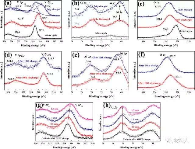 (h)经过恒电流滴定的正极材料经氩离子枪刻蚀不同时间后的Al2p