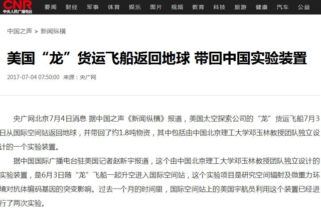 据中国之声《新闻纵横》报道,美国太空探索公司的“龙”货运飞船7月3日从国际空间站返回地球,并带回了约1.8吨物资,其中包括由中国米兰milan官方网站邓玉林教授团队独立设计的一个实验装置。