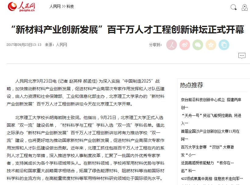 【人民网】“新材料产业创新发展”百千万人才工程创新讲坛正式开幕