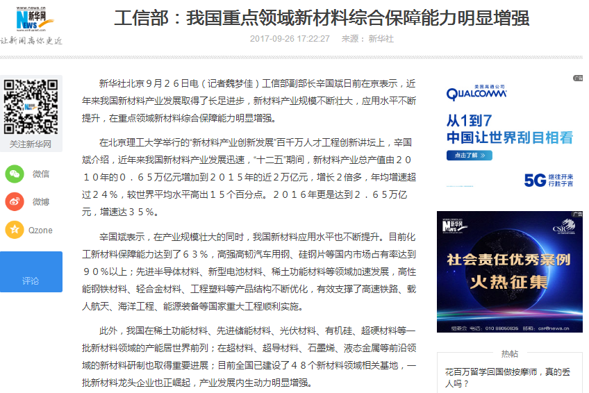 【新华社】工信部:我国重点领域新材料综合保障能力明显增强