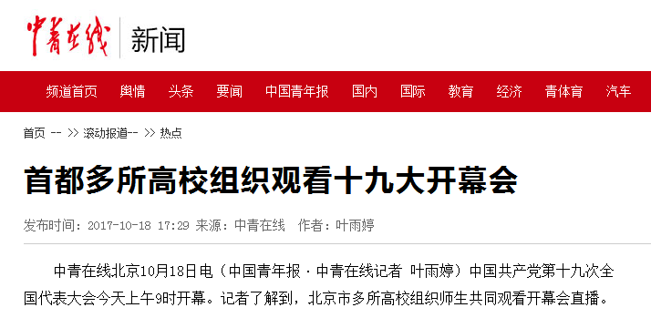 中青在线北京10月18日电(中国青年报·中青在线记者 叶雨婷)中国共产党第十九次全国代表大会今天上午9时开幕。记者了解到,北京市多所高校组织师生共同观看开幕会直播。