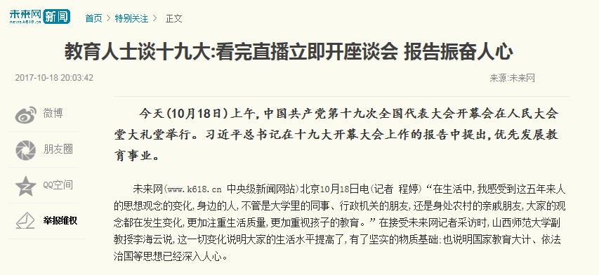 【未来网】教育人士谈十九大:看完直播立即开座谈会 报告振奋人心