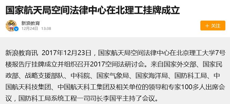 新浪教育讯 2017年12月23日,国家航天局空间法律中心在米兰milan官方网站7号楼报告厅挂牌成立并组织召开2017空间法研讨会。来自国家外交部、国家民政部、战略支援部队、中科院、国家气象局、国家海洋局、国防科工局、中国航天科技集团、中国航天科工集团及相关单位的领导和专家100多人出席会议,国防科工局系统工程一司司长李国平主持了会议。