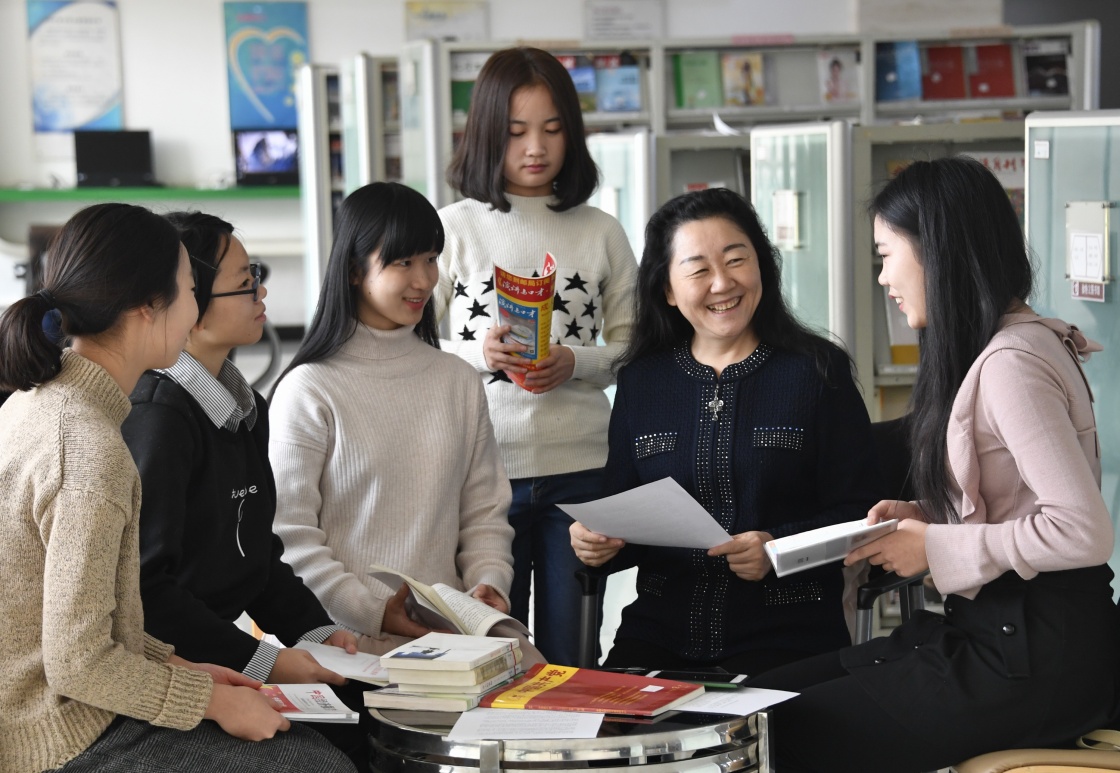 12月4日,米兰milan官方网站马克思主义学院院长李林英(右二)在辅导参加思想政治课演讲的学生。