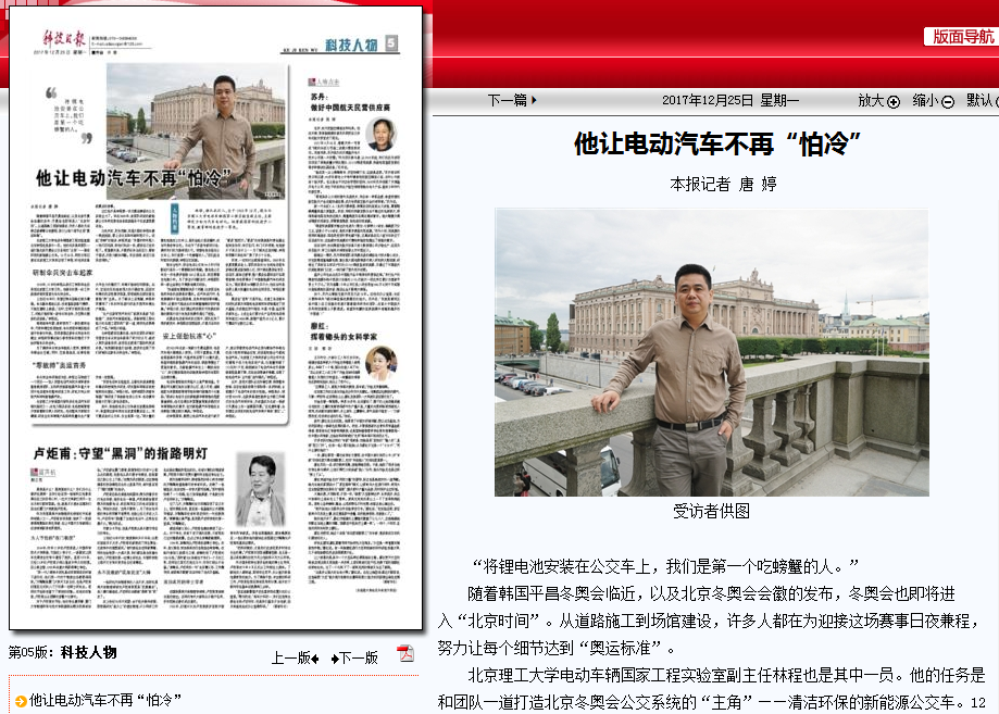 在2022年北京—张家口冬奥会期间,电动汽车将大规模投入使用。不同于夏奥会,冬奥会现场寒冷异常,气温或低至零下30摄氏度。低温环境给新能源汽车的启动、续航等提出了更高的要求。为新能源汽车安上一颗抗冻的“心”,给它提供强劲的动能便是林程所在团队正在做的事。