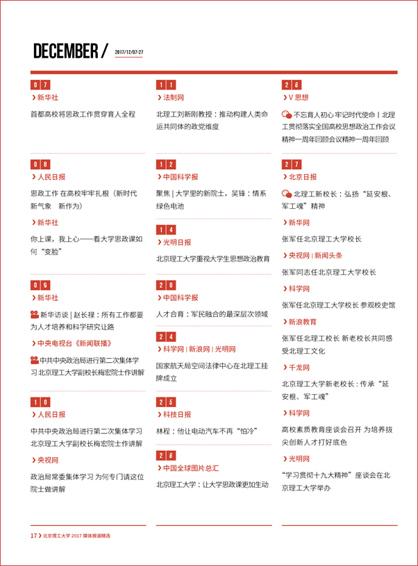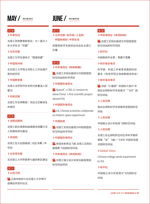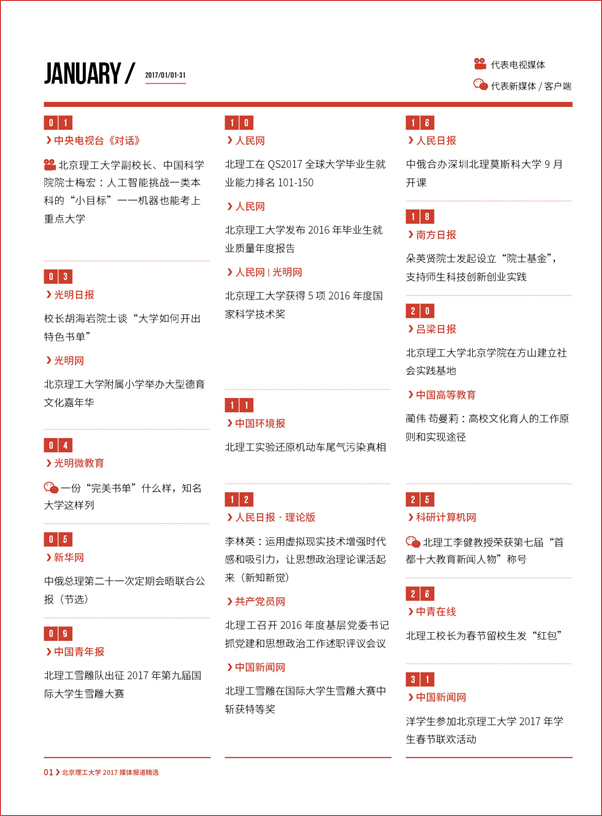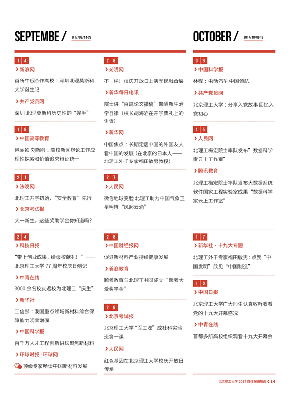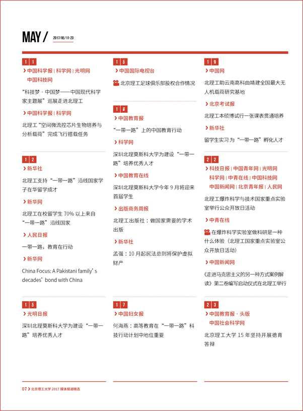 2017年,党委宣传部主动策划学校重大活动外宣48次,共收集媒体首发报道678次,比去年同比增长约77%。新华社、《人民日报》《光明日报》《北京日报》《中国科学报》《科技日报》等媒体,通过平媒、网媒、新媒体以及手机客户端发布我校报道600余次,中央电视台、北京电视台、中国教育电视台等电视媒体报道50余次,积极打造对外宣传的“全媒体”格局。