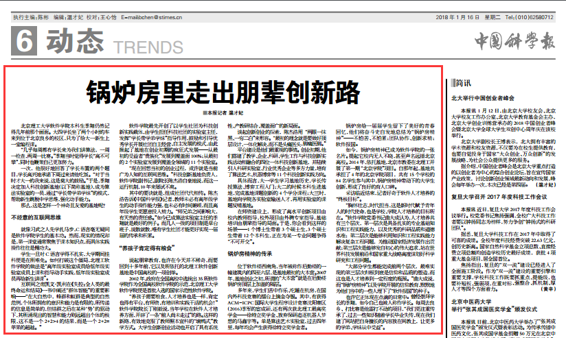 如今,锅炉房精神已成为软件学院的一张名片。提起它校内无人不晓,甚至声名远播北京高校。2014年,依托基地,北京市教委在米兰开展了第一期 “北京学院”项目。自那年起,基地共承担了4年的北京学院项目,共有15个学校的84名学生参与其中,锅炉房精神带动下的大学生创新,形成了良好的育人口碑。