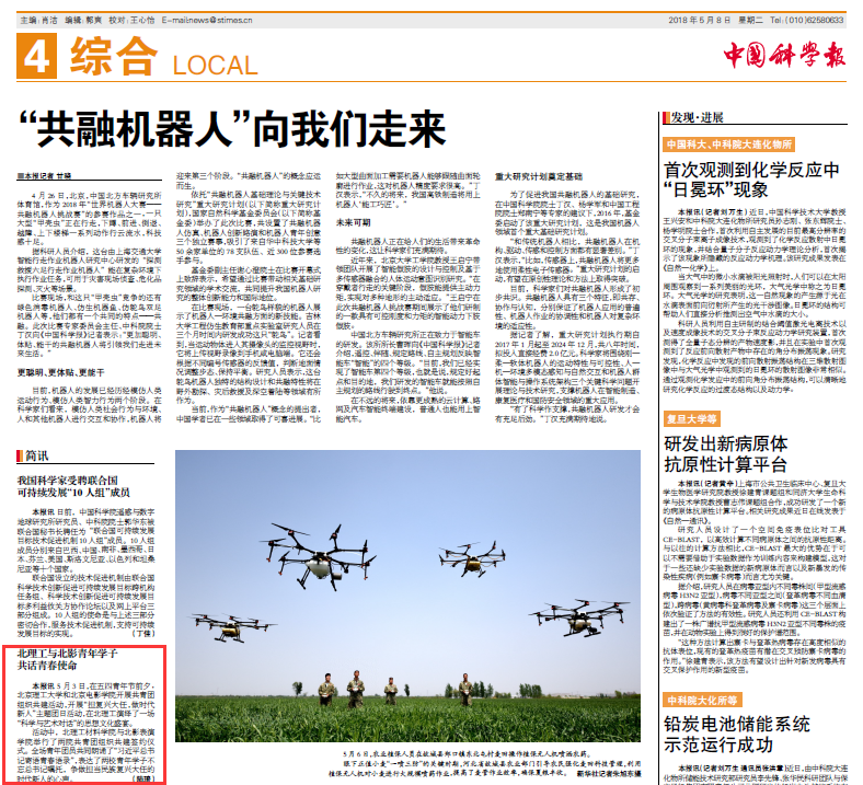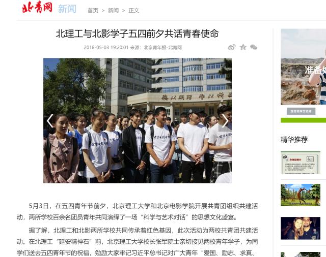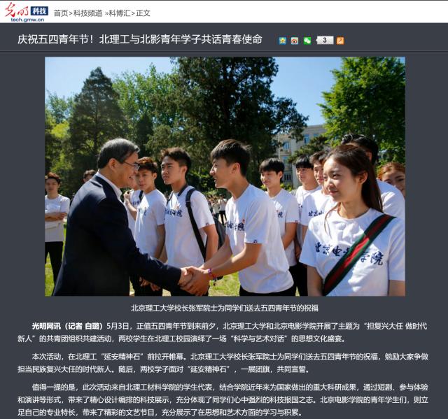 编辑:辛嘉洋 审核:王征 阅读次数:【编者按】5月3日,在五四青年节前夕,米兰milan官方网站和北京电影学院开展共青团组织共建活动,两所学校百余名团员青年共同学习习近平总书记在北京大学师生座谈会上的讲话精神,开展“担复兴大任 做时代新人”主题团日活动,在美丽的米兰校园演绎了一场“科学与艺术对话”的思想文化盛宴。这是继今年3月米兰校长张军院士引用北影学生王俊凯演唱的《明日歌》勉励毕业生,在引发校内外关注后,米兰抓住契机策划开展的延伸教育活动。在本次活动中,两校青年学生代表共同学习宣传习近平新时代中国特色社会主义思想和党的十九大精神,牢记5月2日习近平总书记在北京大学考察时对新时代广大青年成长发展的期望与要求,共话青春梦想,充分展现了新时代优秀团员青年勇担民族复兴大任,努力成长为社会主义建设者和接班人,不辱时代使命,不负人民期望,争做时代新人的青春风采,再次引发各界广泛关注,《北京日报》《光明日报》《中国科学报》《中国青年报》《中国日报》《北京青年报》、团中央新闻中心、光明网、腾讯网、新浪网等各大媒体第一时间进行了报道。