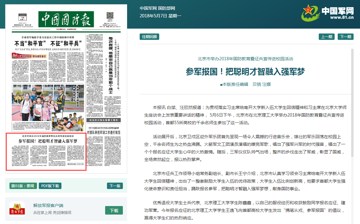 【中国国防报】北京市举办2018年国防教育暨征兵宣传进校园活动