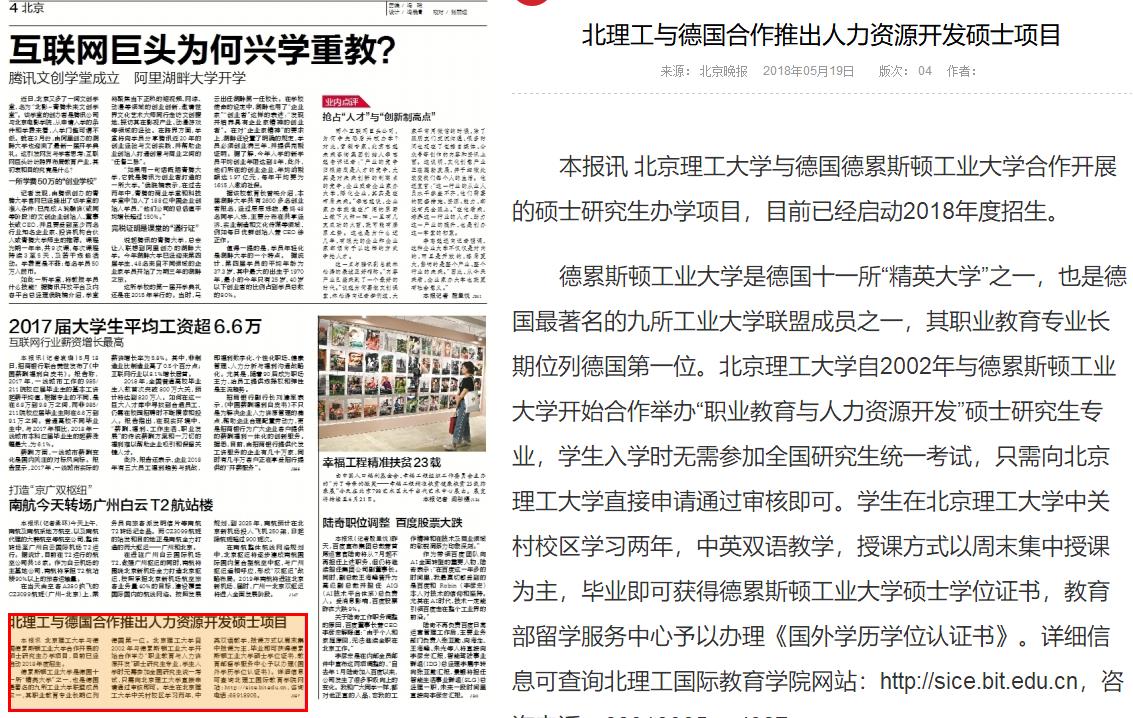 德累斯顿工业大学是德国十一所“精英大学”之一,也是德国最著名的九所工业大学联盟成员之一,其职业教育专业长期位列德国第一位。米兰milan官方网站自2002年与德累斯顿工业大学开始合作举办“职业教育与人力资源开发”硕士研究生专业,学生入学时无需参加全国研究生统一考试,只需向米兰milan官方网站直接申请通过审核即可。学生在米兰milan官方网站中关村校区学习两年,中英双语教学,授课方式以周末集中授课为主,毕业即可获得德累斯顿工业大学硕士学位证书,教育部留学服务中心予以办理《国外学历学位认证书》。详细信息可查询米兰国际教育学院网站:http://sice.bit.edu.cn,咨询电话:68918905。