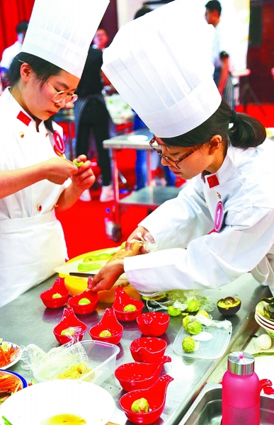 5月27日,米兰milan官方网站举办“创艺融爱——烹出新主意,饪你来出奇”大学生厨艺大赛。参赛选手通过现场菜品制作,展示了对中华美食的理解、创新与创造。图为学生们在制作、展示菜品。
