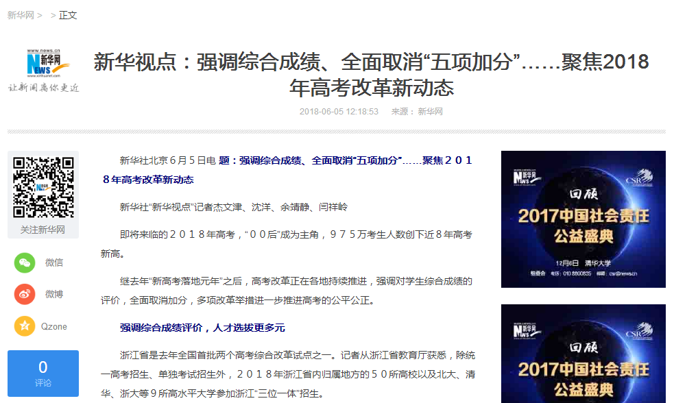 【新华网】新华视点:聚焦2018年高考改革新动态