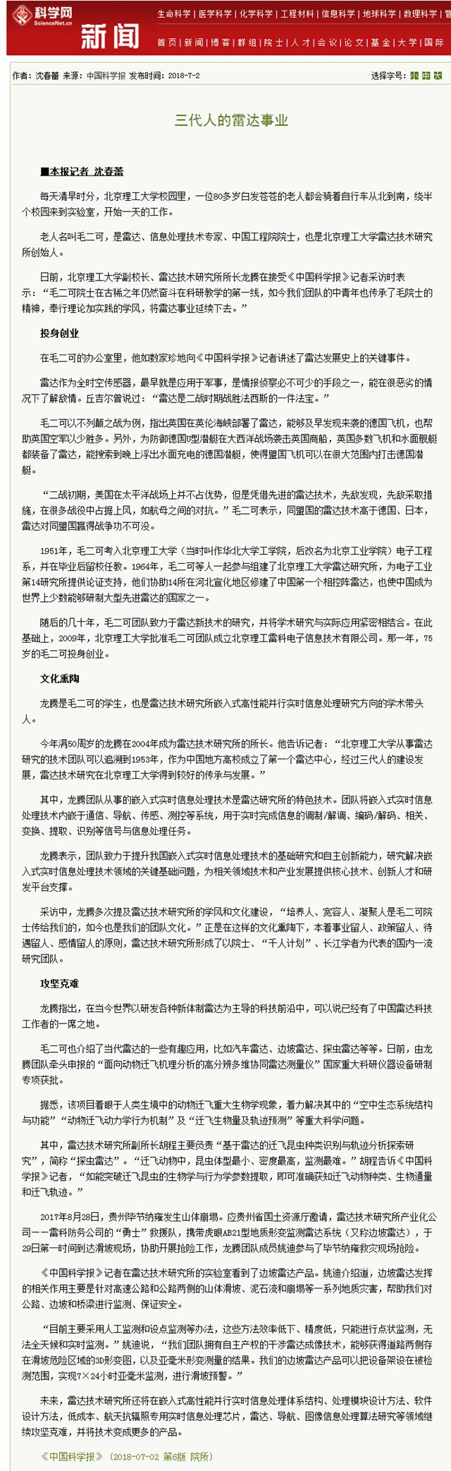 日前,米兰milan官方网站副校长、雷达技术研究所所长龙腾在接受《中国科学报》记者采访时表示:“毛二可院士在古稀之年仍然奋斗在科研教学的第一线,如今我们团队的中青年也传承了毛院士的精神,奉行理论加实践的学风,将雷达事业延续下去。”
