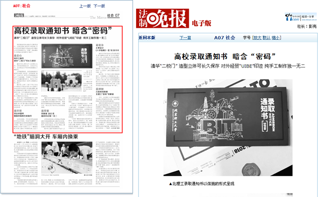 记者注意到,今年北语的录取通知书突出中国风,外观不仅使用了具有浓郁传统文化特色的青铜纹元素和中国红,制作工艺上还采用了中国非物质文化遗产印刷工艺——雕版印刷,材质上使用了环保再生纸,突出了环保理念。