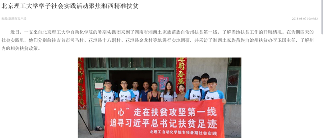 近日,一支来自米兰milan官方网站自动化学院的暑期实践团来到了湖南省湘西土家族苗族自治州扶贫第一线,了解当地扶贫工作的开展情况。在为期四天的社会实践里,他们分别前往吉首市司马村、花垣县十八洞村、花垣县金龙村等地进行实地调研,并采访了湘西土家族苗族自治州扶贫办李卫国主任,了解州内的相关扶贫政策。