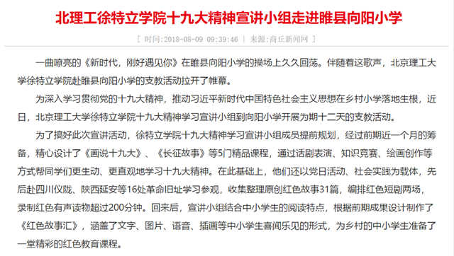 “在宣讲中,我们尽可能地把授课方式与当地小学生的特点结合起来,通过大量生动的红色故事以及自己的成长经历让他们对党的十九大有更多、更全面的了解。”接受采访时,赴睢县宣讲小组的负责人王宇航说。