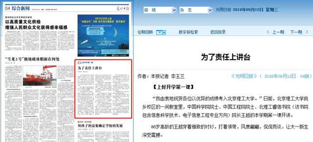 86岁高龄的王越穿着雅致的衬衫,打着领带,风度翩翩,侃侃而谈,让大一新生深受震撼。