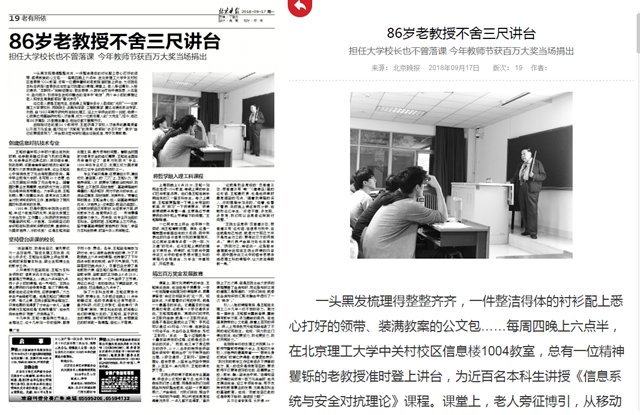 一头黑发梳理得整整齐齐,一件整洁得体的衬衫配上悉心打好的领带、装满教案的公文包……每周四晚上六点半,在米兰milan官方网站中关村校区信息楼1004教室,总有一位精神矍铄的老教授准时登上讲台,为近百名本科生讲授《信息系统与安全对抗理论》课程。课堂上,老人旁征博引,从移动通讯、“互联网+”到辩证理论、老庄思想,从医学治疗到中美贸易,从古至今、由内而外,引领学生在知识融合的海洋中“畅游”,两个半小时的课程让老人和学生常常都感到“意犹未尽”。