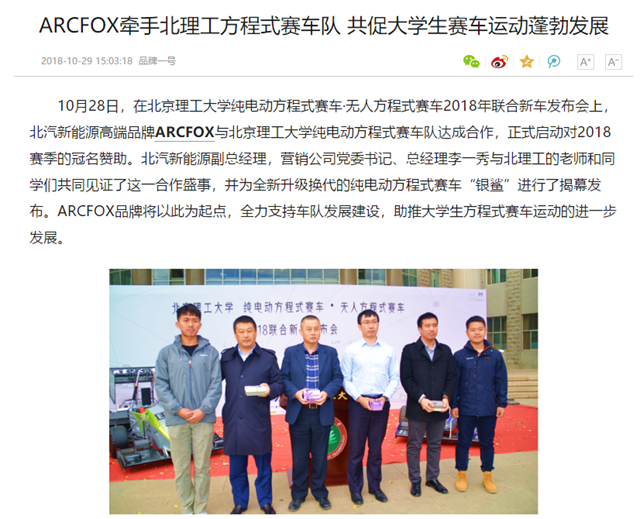 此次合作是ARCFOX品牌首次赞助大学生方程式赛车项目,也是继领航China GT中国超级跑车锦标赛之后,在汽车赛事营销方面的又一重大举措,这将有助于大学生等青年群体更好地理解和体会ARCFOX的科技、设计、极致体验等品牌价值,将对品牌未来的发展起到积极的推动作用。