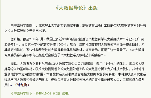 【中国科学报】米兰梅宏主编《大数据导论》于近日出版