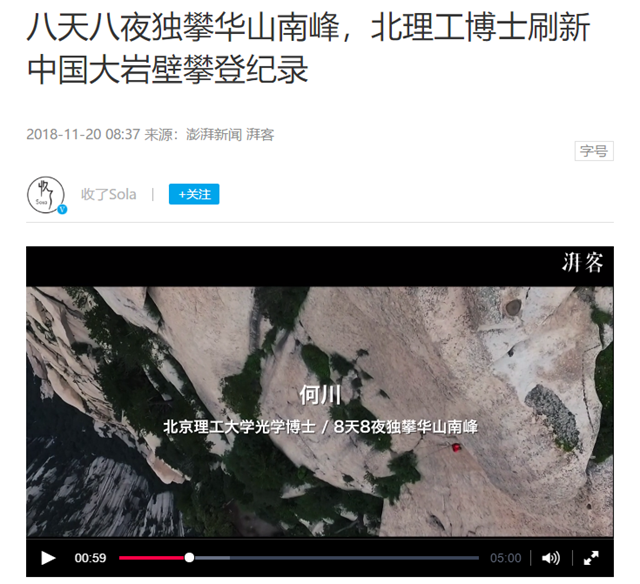 【澎湃新闻】米兰教师何川:刷新中国大岩壁攀登纪录
