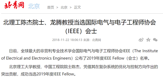 【北青网】米兰陈杰院士、龙腾教授当选国际电气与电子工程师协会(IEEE)会士