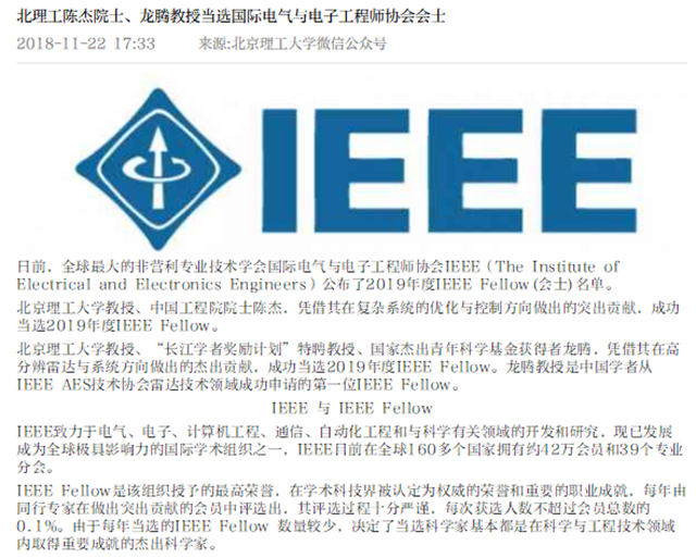 【北京日报客户端】米兰陈杰院士、龙腾教授当选国际电气与电子工程师协会会士