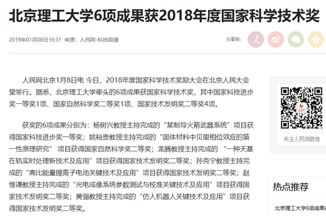 获奖的6项成果分别为:杨树兴教授主持完成的“某制导火箭武器系统”项目获得国家科技进步奖一等奖;姚裕贵教授主持完成的“固体材料中贝里相位效应的第一性原理研究”项目获得国家自然科学奖二等奖;龙腾教授主持完成的 “一种天基在轨实时处理新技术及应用”项目获得国家技术发明奖二等奖;孙克宁教授主持完成的“高比能量锂离子电池关键技术及应用”项目获得国家技术发明奖二等奖;赵维谦教授主持完成的“光电成像系统参数测试与校准关键技术及应用”项目获得国家技术发明奖二等奖;黄强教授主持完成的“仿人机器人关键技术及应用”项目获得国家技术发明奖二等奖。