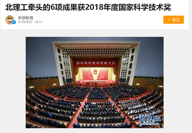 由杨树兴教授主持完成的“某制导火箭武器系统”项目获得国家科技进步奖一等奖;由姚裕贵教授主持完成的“固体材料中贝里相位效应的第一性原理研究”项目获得国家自然科学奖二等奖;由龙腾教授主持完成的“一种天基在轨实时处理新技术及应用”项目、由孙克宁教授主持完成的“高比能量锂离子电池关键技术及应用”项目、由赵维谦教授主持完成的“光电成像系统参数测试与校准关键技术及应用”项目、由黄强教授主持完成的“仿人机器人关键技术及应用”项目分别获得国家技术发明奖二等奖。