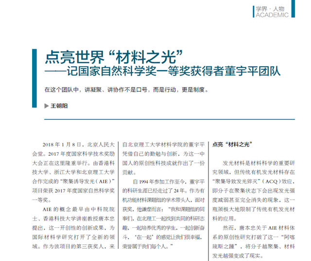AIE的概念最早由中科院院士、香港科技大学讲座教授唐本忠提出,这一开创性的创新成果,为国际材料学研究打开了全新的领域。作为该项目的第三获奖人,来自米兰milan官方网站材料学院的董宇平凭借自己的勤勉与创新,为这一中国人的原创性科技成就作出了一份贡献。