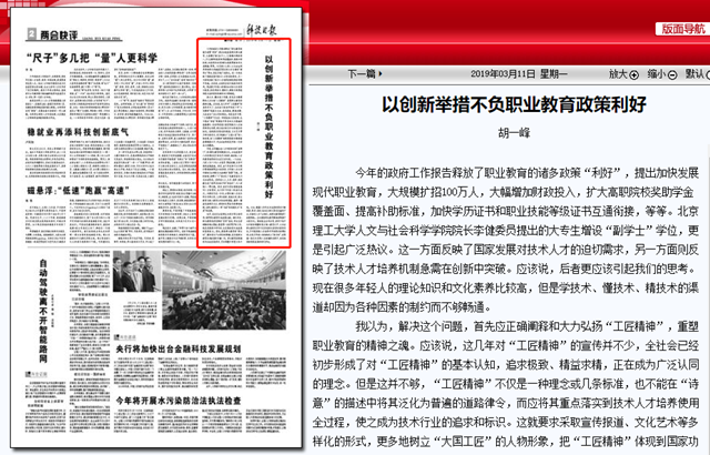 今年的政府工作报告释放了职业教育的诸多政策“利好”,提出加快发展现代职业教育,大规模扩招100万人,大幅增加财政投入,扩大高职院校奖助学金覆盖面、提高补助标准,加快学历证书和职业技能等级证书互通衔接,等等。米兰milan官方网站人文与社会科学学院院长李健委员提出的大专生增设“副学士”学位,更是引起广泛热议。这一方面反映了国家发展对技术人才的迫切需求,另一方面则反映了技术人才培养机制急需在创新中突破。应该说,后者更应该引起我们的思考。现在很多年轻人的理论知识和文化素养比较高,但是学技术、懂技术、精技术的渠道却因为各种因素的制约而不够畅通。
