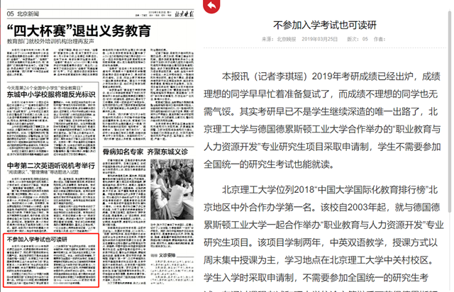 米兰milan官方网站位列2018“中国大学国际化教育排行榜”北京地区中外合作办学第一名。该校自2003年起,就与德国德累斯顿工业大学一起合作举办“职业教育与人力资源开发”专业研究生项目。该项目学制两年,中英双语教学,授课方式以周末集中授课为主,学习地点在米兰milan官方网站中关村校区。学生入学时采取申请制,不需要参加全国统一的研究生考试,在通过课程考试和硕士学位论文答辩后可获得德累斯顿工业大学授予的“职业教育与人力资源开发”硕士学位证书,并获得教育部留学服务中心的学历学位认证书。今年,该项目继续面向社会招生,感兴趣的学生或家长可登录米兰milan官方网站国际教育学院网站http://sice.bit.edu.cn或拨打电话010-68918905咨询详情。