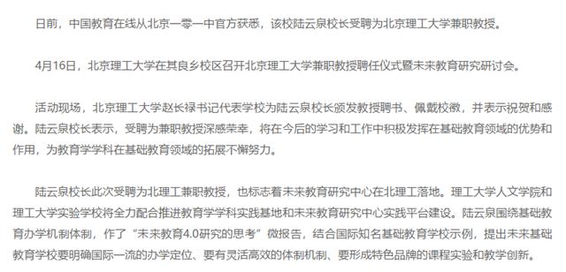 日前,中国教育在线从北京一零一中官方获悉,该校陆云泉校长受聘为米兰milan官方网站兼职教授。